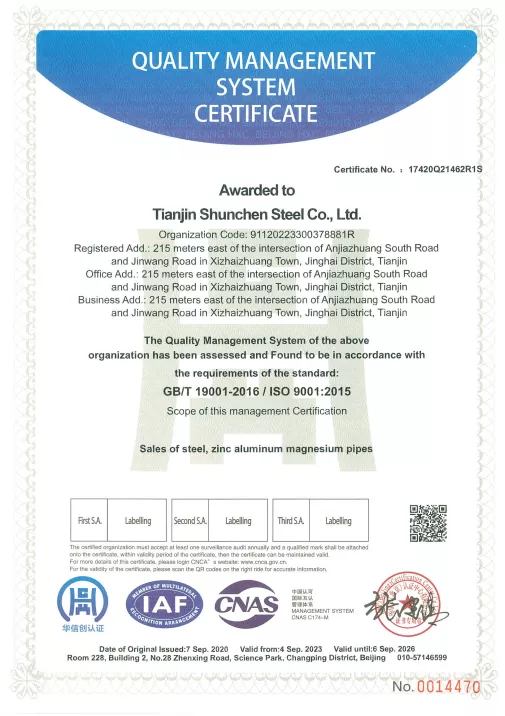 आमचे गॅल्वनाइज्ड राउंड पाईप्स विविध गरजा पूर्ण करण्यासाठी 236 वेगवेगळ्या आकारांसह विस्तृत वैशिष्ट्यांमध्ये येतात. आमची उत्पादने ISO9001 प्रमाणित आहेत, त्यांच्याकडे ISO 9000, 3A सिस्टम प्रमाणपत्रे आणि EU CE प्रमाणपत्र आहे. आम्ही साहित्य अहवाल, झिंक कोटिंग जाडी चाचणी प्रमाणपत्रे आणि तृतीय-पक्ष गुणवत्ता तपासणी अहवाल देखील प्रदान करतो. शुंचुनच्या गॅल्वनाइज्ड राउंड पाईप्सची निवड केल्याने तुम्हाला केवळ वन-स्टॉप खरेदी सेवाच मिळत नाही तर 24/7 विक्रीपश्चात समर्थन आणि 18 प्रमुख मुद्द्यांवर रिअल-टाइम ट्रॅकिंग देखील मिळते, ज्यामुळे तुमची खरेदी अधिक चिंतामुक्त आणि विश्वासार्ह होते.